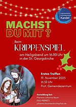 wir suchen Darstellerinnen und Darsteller für unser Krippenspiel im Familiengottesdienst am Heiligabend um 16.00 Uhr. Große und kleinere Kinder - ab 4 Jahre - sind herzlich willkommen.