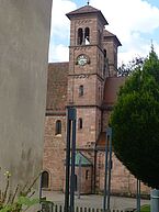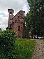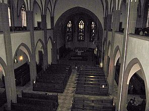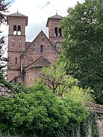 Seitlich und unten gibt es befestigte und gut ausgebaute Wege. Nach Durchqueren der Klamm und Erreichen der Höhe ging es weiter nach Bruchmühlbach-Miesau. Immer im Wald am Ort entlang. Der Weg schien nicht enden zu wollen. Doch schließlich kam der Abzweig in den Ort zur Spitalkirche. Fast wäre ich daran vorbeigegangen, war ich doch wieder auf der falschen Straße unterwegs. Die Kirche ist nicht sonderlich groß, doch durch Gottes Fügung blickte ich durch zwei Gebäude einer Malerfirma direkt auf den kleinen Kirchturm. Noch zwei mal links gehen und ich war auf der alten Hauptstraße vor der Kirche. Auch hier wieder eine Tafel mit Jakobsweg-Beschreibung. Die Kirche war verschlossen, aber auf dem Gelände nebenan war ein Zelt mit Bänken etc. im Aufbau - etwa ein Gemeindefest? Davor zwei Personen die dem Treiben zusahen. Ich frage nach der Möglichkeit die Kirche zu öffnen. Ja ich hatte Glück, die männliche Person hatte den Schlüssel zur Kirche, optisch war nicht zu erkennen ob Pfarrer, Pastor oder Kaplan. War mir auch egal, ich bekam meinen zweiten Stempel unter das Tagesmotto, welches sich der Stempelgeber interessiert anhörte. Mit dem Hinweis auf den weiteren Verlauf des Weges verabschiedeten wir uns.