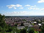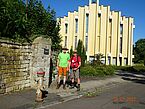 Aus der Jugendherberge heraus ist auf gerade ansteigender Straße sofort eine Jakobsmuschel an einer Laterne zu erkennen. Keine 30m weiter die Nächste und wieder Eine und wieder Eine. Die gelben Muscheln auf blauem Grund sind omnipräsent. Am Ende des Anstiegs geht es nach rechts, wo im Hintergrund das Herz-Jesu-Kloster zu sehen ist. Wir sehen ein Schild, dass dort auch Übernachtungen möglich sind. Also das nächste Mal Übernachtung im Herz-Jesu-Kloster. Durch diesen Anstieg haben wir uns einen wunderbaren Ausblick auf das sonnenbeschienene Neustadt erlaufen. Am blauen Himmel ziehen helle Wolken vorbei.