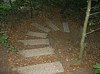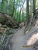Hier am Krämerstein fand ich auch die Muschel wieder und eine Tafel mit Informationen zum Jakobsweg. Von hier aus weiter der Route mit grün/gelben Kreuz und weißem Strich mit schwarzem Punkt folgend in die wild romantische Schlucht des Fleischackerlochs. Tatsächlich mit der oben beschriebenen Stille. Was mich bedenklich stimmte war der ausgetrocknete Bach den ich überquerte.