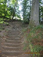 Gleich nach der Pause der nächste Dämpfer, erst ein Anstieg, danach in einem Hohlweg bergab. Unten an der Weggabelung keine Markierungen, die Karte zu rate gezogen und festgestellt, dass ich weiter oben einen Abzweig übersehen haben musste. Und tatsächlich oben ein kleiner Weg mit überwachsenen Markierungen. Hier also weiter. Bald erreichte ich die Kehrberghütte des PWV welche leider geschlossen hatte. Weiter ging es über den Karlsberg zur Ruine Schloss Karlsberg. Etwas weiter die Ruine der Orangerie. Gut gekennzeichnet ging es weiter bis zur L120. Es waren drei Wege an dieser Stelle, auf der Karte ist nicht zu erkennen welches der Richtige ist. Und prompt wieder plus 800 m erst bergab und wieder hinauf. Auf Verdacht nahm ich einen Schotterweg welcher grob Richtung Homburg ging. Grundsätzlich ging es wieder bergauf. Nach ca. 200 m kam ein Pfad mit weißem Strich und schwarzem Punkt, ich fragte mich, wo der wohl herkam. Weitere 300 m weiter traf ich auf Wegweiser, damit war klar, dass ich nun wieder richtig war. Es lief zu diesem Zeitpunkt immer die Angst, sich nochmals zu verlaufen, mit. Meine Kondition war zu dem Zeitpunkt ziemlich am Ende. Der Pfad führte durch einen lichten Wald, an jeder Abzweigung Zweifel. Hier konnte ich mich anhand der Stromleitungen über mir orientieren, so ging es vorbei am Stumpfen Gipfel und dem Hasenhübel. Hier wechselte die Markierung zu gelbem Kreuz und die Streckenführung wurde insgesamt klarer. Am Hasenhübel war ich in der nähe der Uniklinik Homburg, was auch an den Hubschrauberflügen merkbar war. Am Roten Hübel verließ ich den Jakobsweg mit gelben Kreuz und wechselte auf dem mit Wachturm beschilderten Weg. Dieser führte in einer Schleife vorbei an keltischen Hügelgräbern zum Rabenhorst meinem Etappenziel dem Wohlfühlhotel Rabenhorst.