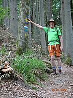 Wir gehen vor dem Gebäude vorbei und erkennen im Hintergrund einen schmalen Weg der in den Wald führt. Und tatsächlich, da prangt wieder eine Jakobsmuschel an einem Baum. Jetzt ist es Zeit für mich die Wanderstöcke auszuziehen und einzusetzen, denn jetzt geht es steil bergan. Auf dem schmalen Wanderweg tauchen jetzt wieder ab und an die Jakobsmuscheln auf, wiewohl auf diesem schmalen Weg keine Abzweigung möglich ist. Nach geraumer Zeit und Mühe im Anstieg, haben wir den Gipfel erreicht, der nicht mit einem Gipfelkreuz gekrönt ist, sondern mit einer schönen großen Holzbank, die wir für unsere erste Rast an diesem Tag nutzen. Wir essen eine Kleinigkeit damit der Blutzuckerspiegel gehalten wird. Trinken ist sowieso ein Muss bei diesem heißen Wetter.